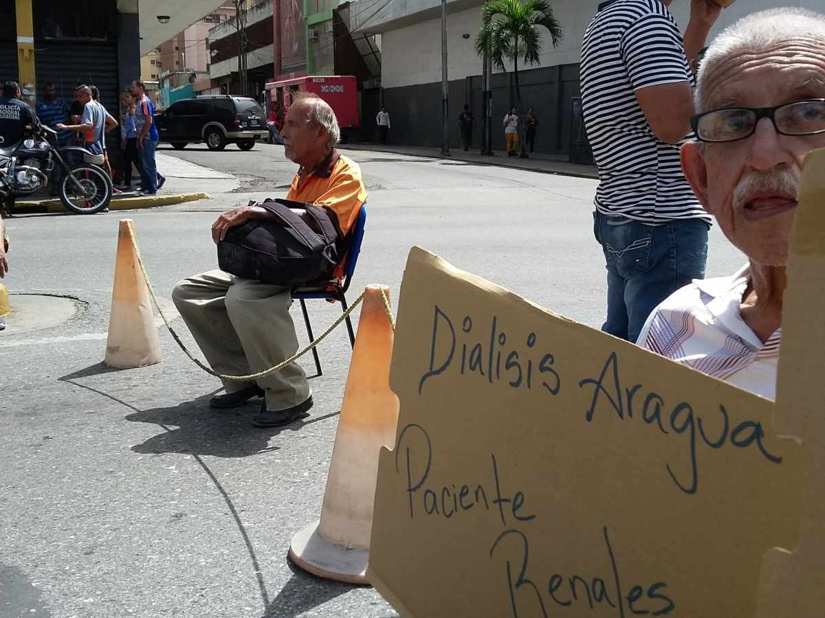 Pese a la debilidad física, varios de los enfermos renales que son atendidos en el Centro de Diálisis Maracay, dependiente del IVSS, cerraron la avenida Bolívar para exigir personal médico y de enfermería y el urgente suministro de agua, vital para dializarse.