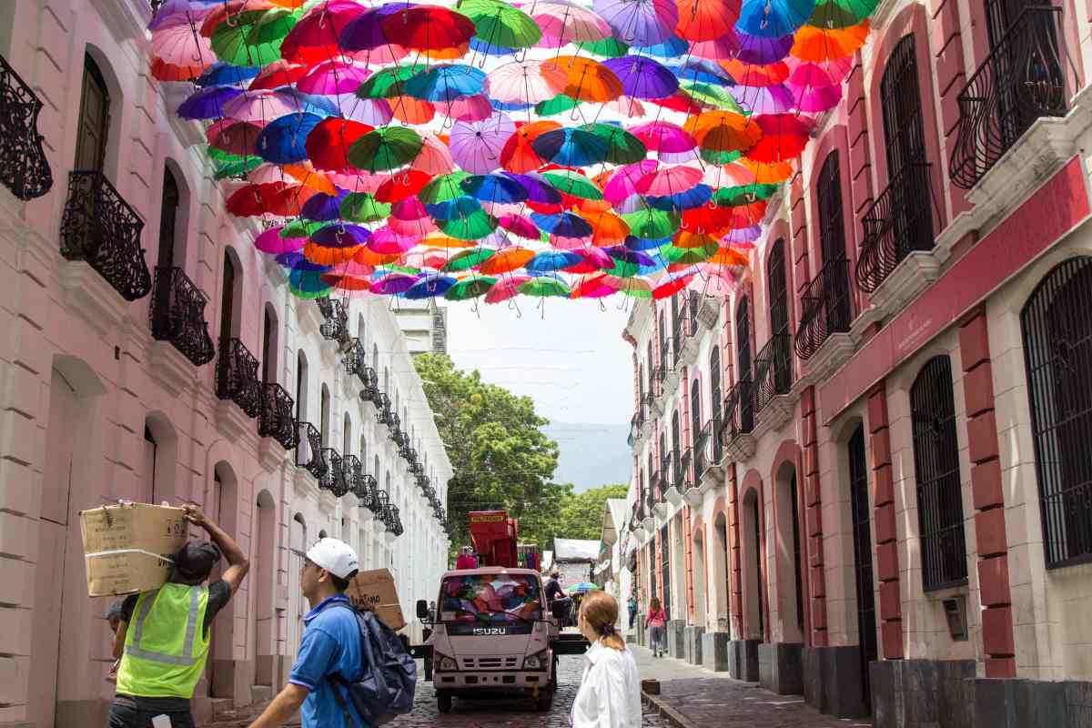 La marca de las sombrillas dispuestas entre los dos edificios que cubren el paseo es de una empresa familiar de origen español y su centro logístico se encuentra en la Zona Libre de Colón, Panamá.