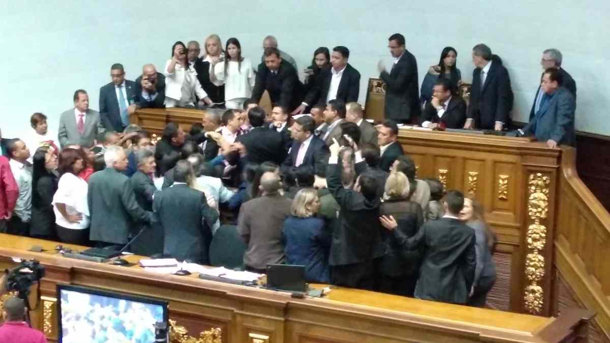 Inmediatamente, la parlamentaria se levantó de su asiento y subió hasta la tribuna de oradores para encarar a Guzmán, seguida de sus compañeros de fracción. El jefe de la bancada del Gran Polo Patriótico (GPP), Héctor Rodríguez, se adelantó y le gritó a Guzmán: “No te metas con las mujeres”. El Parlamento se empezó a parecer al patio de un colegio y desde los palcos se alentaba a los diputados a comenzar la pelea.