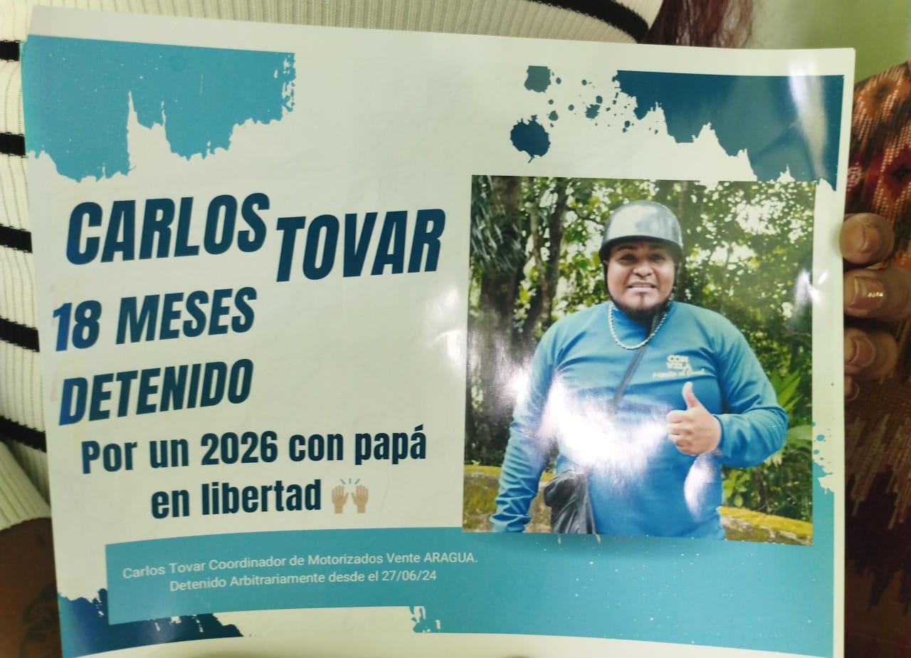Carlos, de 32 años de edad, era coordinador de Motorizados Vente, en el estado. Está preso desde el 27 de junio de 2024, cuando su hijo menor cumplía seis años. Al día siguiente el candidato a la presidencia por la oposición venezolana, Edmundo González Urrutia, visitó por segunda vez Aragua.