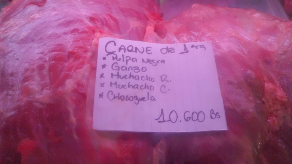 Luego de varios meses de escasez, apareció la carne en el Mercado Municipal de Quinta Crespo: solomo, lomito, pulpa negra y muchacho redondo se ofrecían a un precio entre 10.600 y 13.900 bolívares. El aumento fue de 341 % desde el 28 de diciembre, último registro de precios, hasta la fecha.