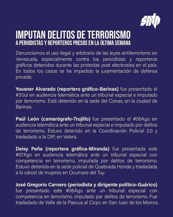 - Carreño es uno de los 13 activistas detenidos del partido Voluntad Popular. Otros de los detenidos son Freddy Superlano, arrestado el 30 de julio, y Jeancarlos Rivas, representante juvenil de la tolda política y estudiante de Comunicación Social.