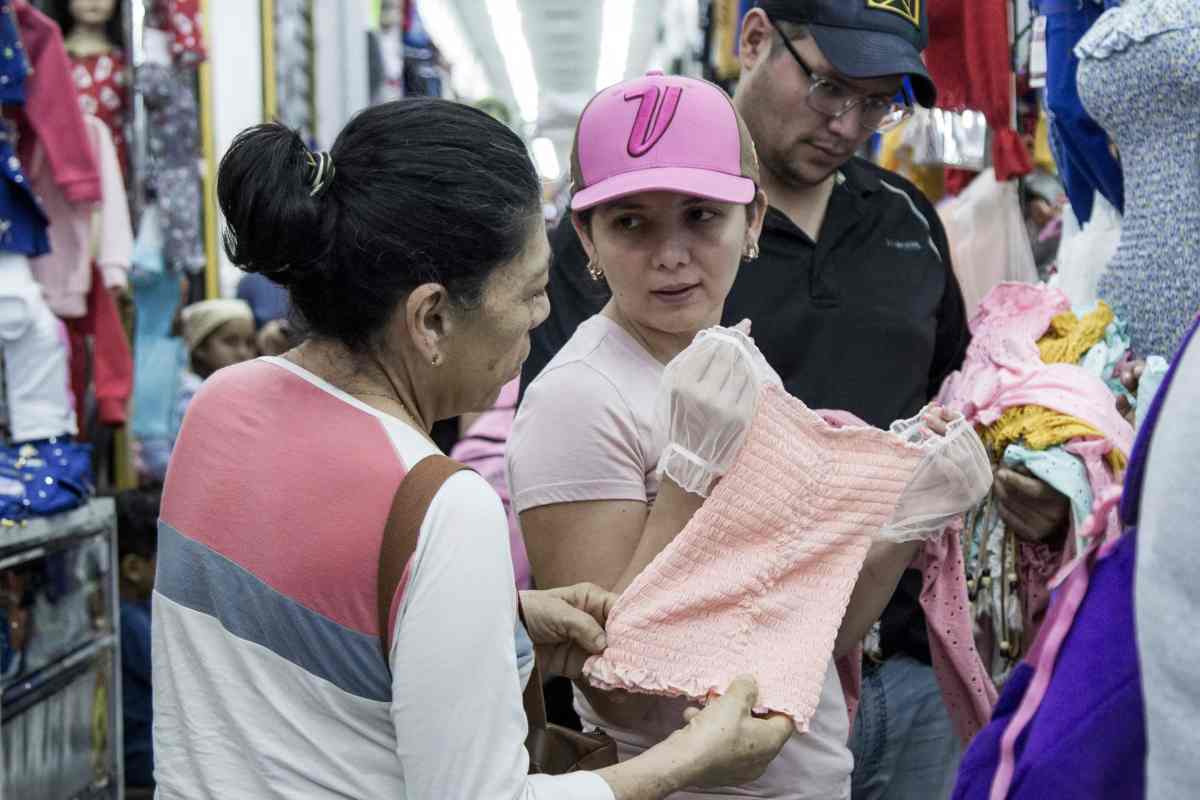 María Suárez lleva a su hija en brazos y una sola bolsa en la mano, se pasea por los pasillos del Mercado Popular de La Hoyada en busca de ropa para ella y su niña, de tres años de edad. La madre consiguió tres camisas por $10, todas de diferentes modelos y de algodón.