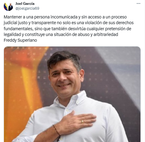 El excandidato a la primaria presidencial de la oposición tampoco tiene derecho a designar un abogado de su confianza. Joel García, abogado de Superlano, asegura a través de su cuenta en X (antes Twitter) que le violan sus derechos fundamentales.