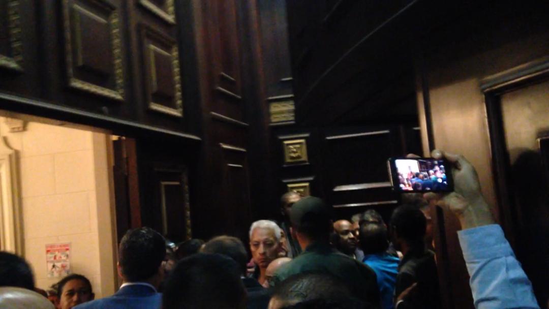 De inmediato, otro pequeño grupo integrado por unas 4 personas trató de entrar al área de los diputados. El personal de seguridad de la AN procedió a cerrar las puertas del Hemiciclo y comenzó un forcejeo. Uno de los sindicalistas, Heber Eduardo Caballero, aseguraba que ellos habían solicitado un derecho de palabra a la plenaria pero nunca mostró la comunicación firmada por Secretaría. “¡Queremos paz, no queremos intervención!”, decían.