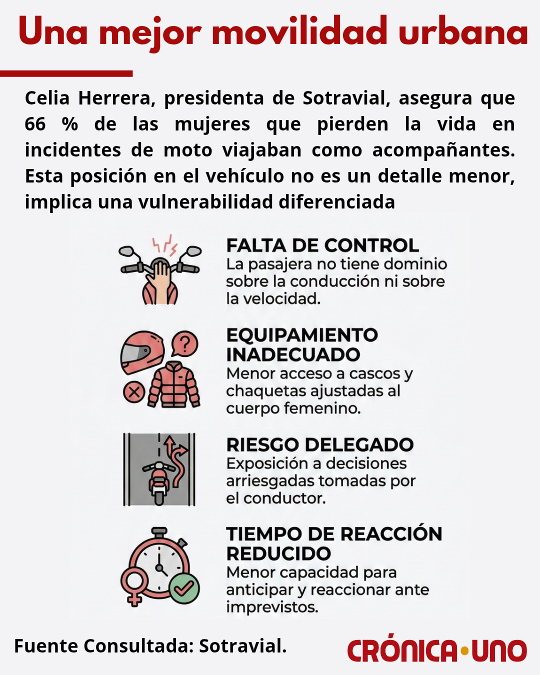 Entre 55 % y 66 % de las mujeres que murieron en accidentes de moto viajaban como acompañantes. Esta posición en el vehículo no es un detalle menor e implica una vulnerabilidad diferenciada por tres factores: falta de control, equipamiento inadecuado y riesgo delegado.