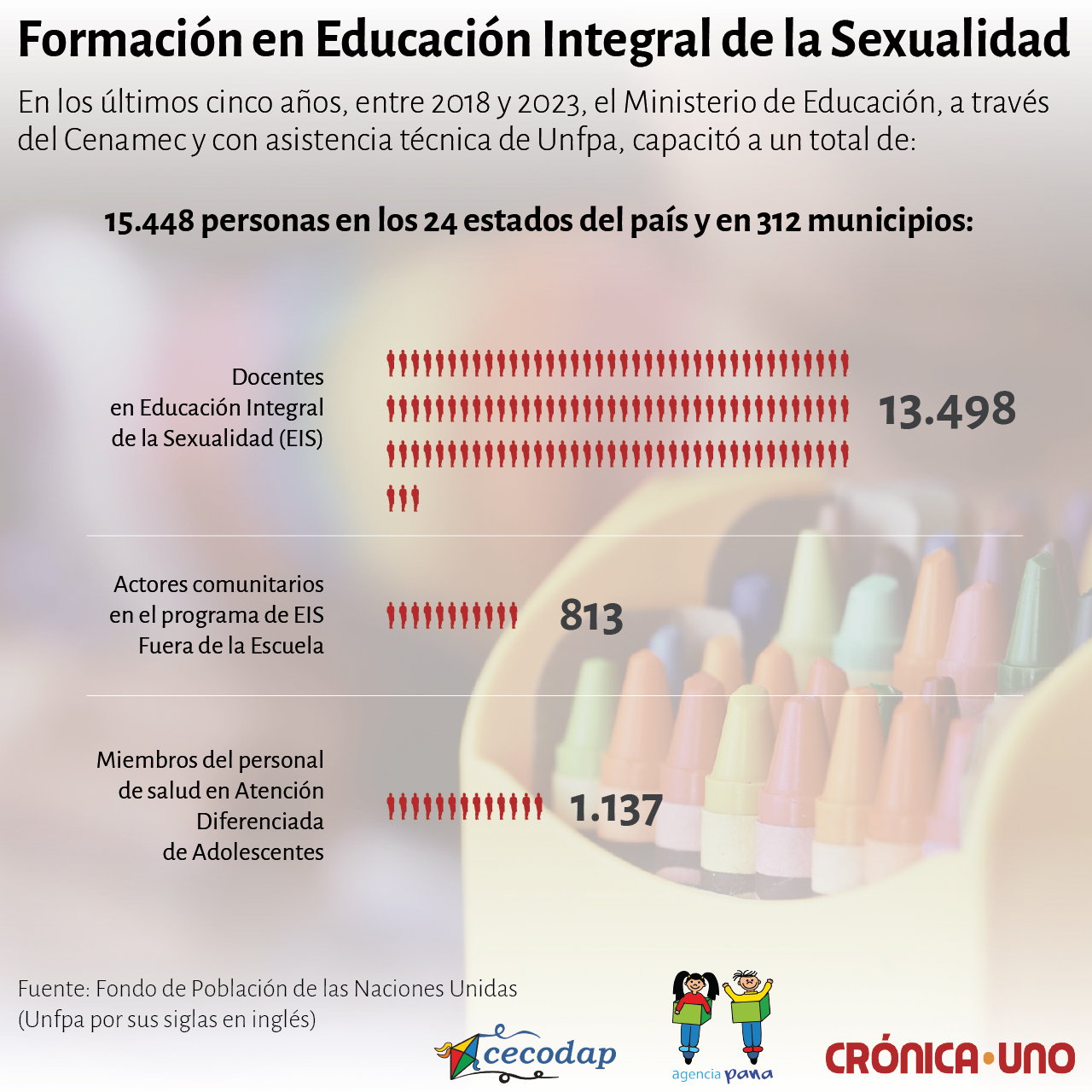 El Ministerio de Educación, en cooperación con la Unfpa, desarrolla claras líneas de trabajo para capacitar a docentes, personal de salud y población general sobre el tema, en escuelas y comunidades. Entre 2018 y 2023 formaron a 13.498 educadores en la materia. La cifra representa al 2,4 % docentes del país, si se toma en cuenta que la última memoria y cuenta del ministerio (2015) registraba 553.948 maestros en todo el territorio.