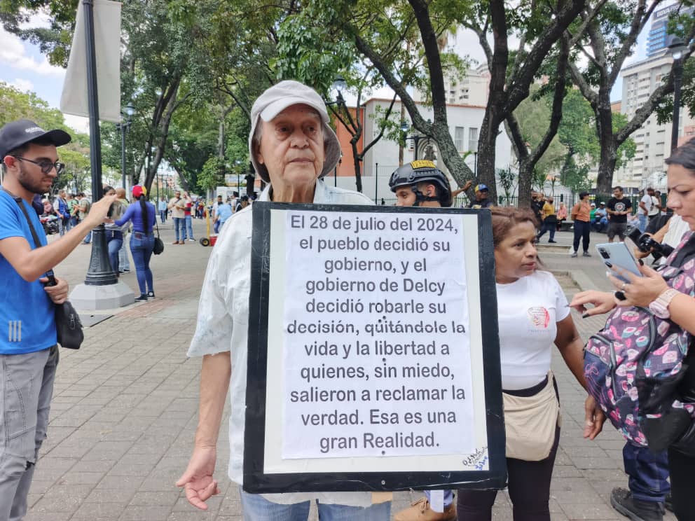 “Nos encerraron como al ganado”, dijo uno de los adultos mayores que asistió a la convocatoria cargando con una camparta que recogía el reclamo por el que fueron a las calles: “salarios dignos para todos”.