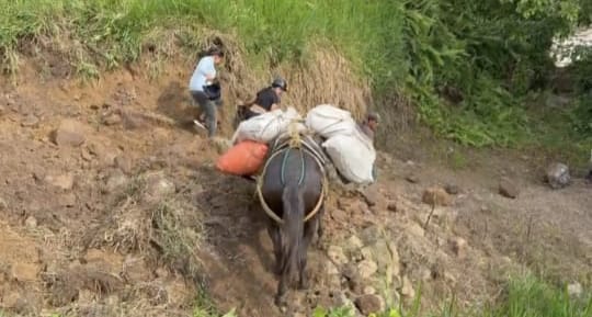 Hasta la mañana de este jueves, 9 de abril, el ingreso de alimentos a las comunidades que están aisladas se realiza en burros o sobre los hombros, ya que no hay un camino por donde puedan transitar vehículos o motocicletas.