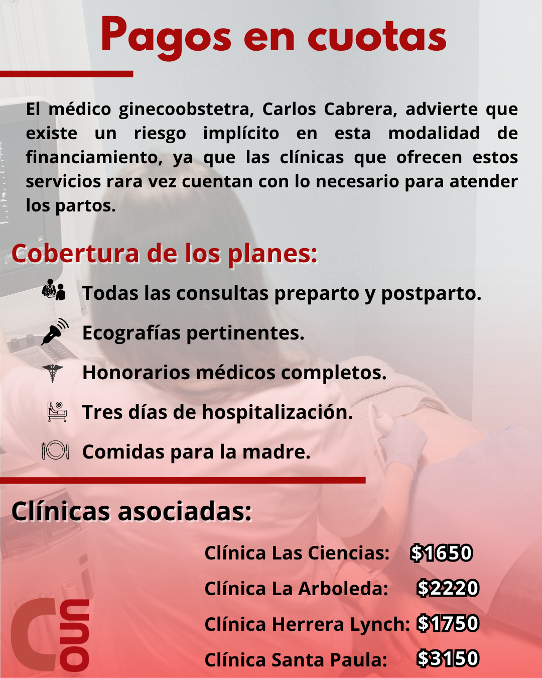 Añadió que en su cuarta consulta el médico le propuso un plan de financiamiento. La oferta cubría los gastos del parto y el posparto en varias clínicas privadas —el monto total depende de la clínica—.