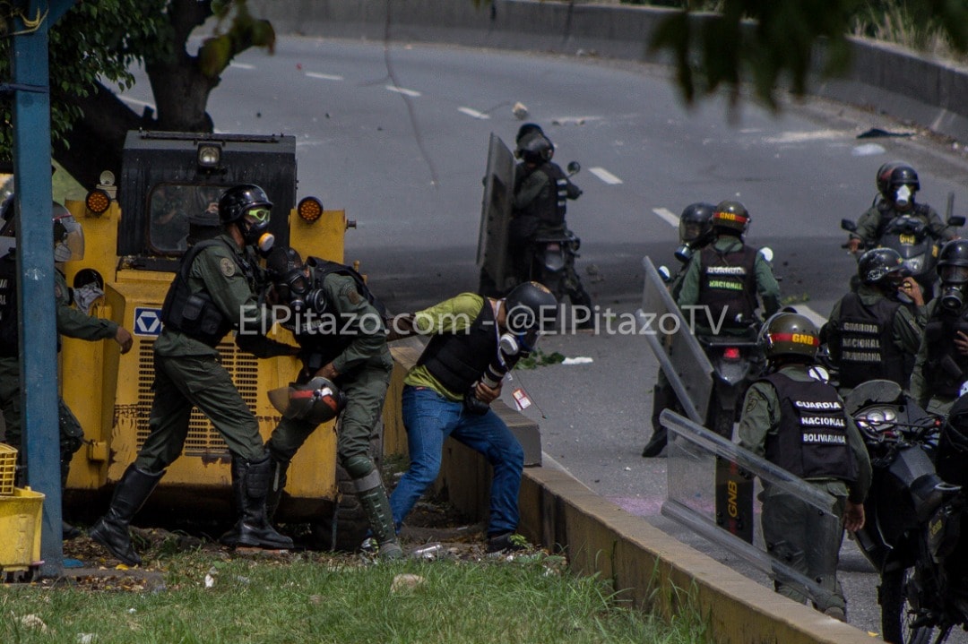 Más de 10 efectivos de la Guardia Nacional Bolivariana le quitaron una cámara y un bolso al reportero gráfico, Francisco Bruzco, mientras cubría la represión en la autopista Francisco Fajardo a la altura de La Carlota. Después del asalto, entre ellos se pelearon por el equipo.