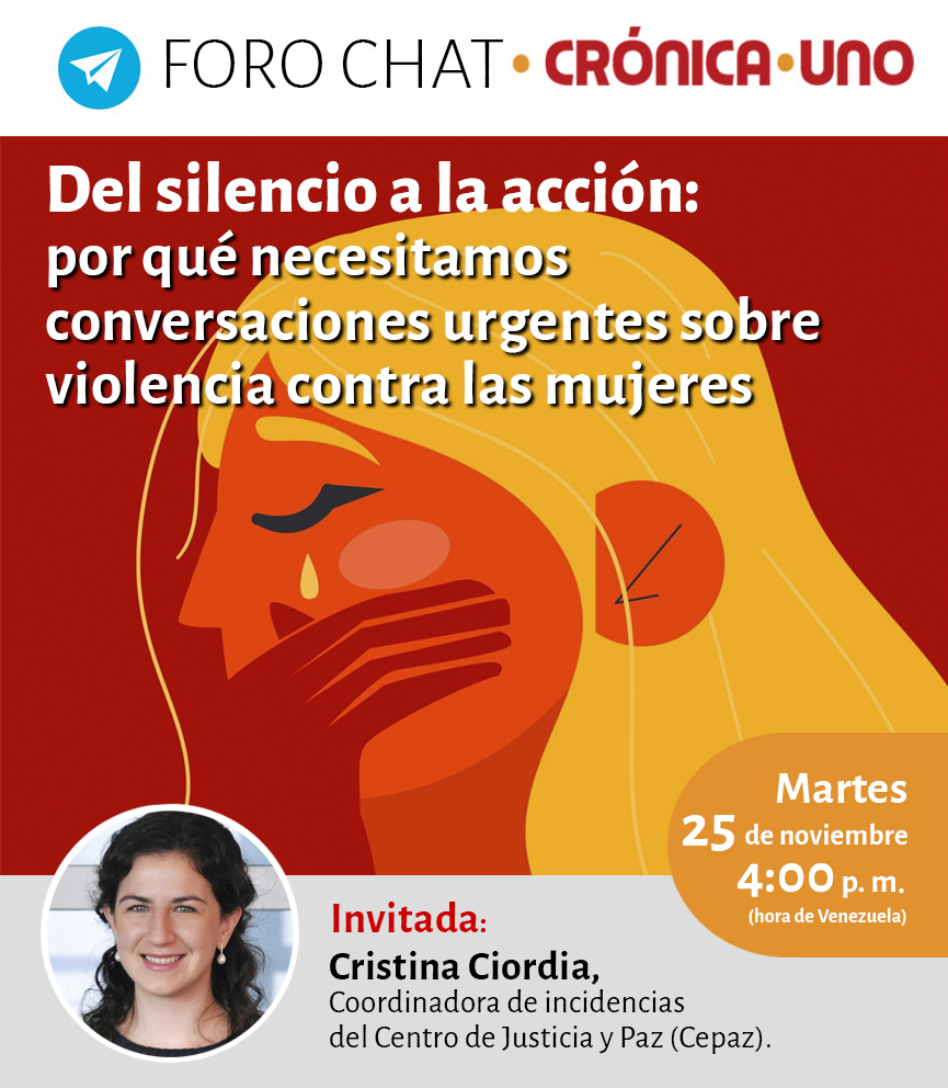 Caracas. A propósito de la conmemoración del Día Internacional de la Eliminación de la Violencia contra la Mujer, Crónica Uno abordará el tema, el martes 25 de noviembre, en el forochat Del silencio a la acción: por qué necesitamos conversaciones urgentes sobre violencia contra las mujeres.
